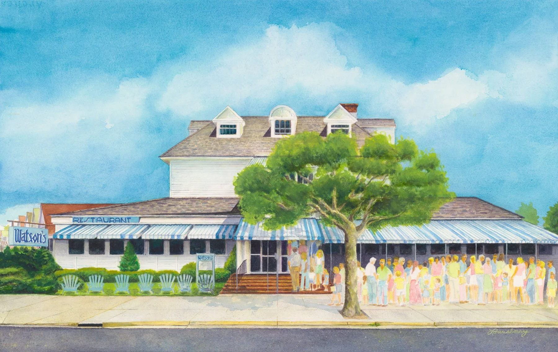 “Watson’s Restaurant” (2026) is a 20 x 30 privately commissioned* original watercolor painting now available as a print